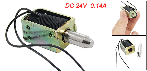 Product Name DC Solenoid Electromagnet Material Metal, Electronic Parts Color As Picture Shown Rated Voltage DC 24V Action Form Pull Stroke & Force 4mm, 30gf Current 0.14A Power 3.38W Total Size 4 x 1.7 x 1.4cm / 1.6" x 0.7" x 0.6" (L*W*H) Coil Size 2.2 x 1.2cm / 0.9" x 0.5" (L*D) Pluger Dia. 0.7cm / 0.3" Cable Length 9cm / 3.5" Net Weight 37.4g Package Content 1 x DC Solenoid Electromagnet - Reviews