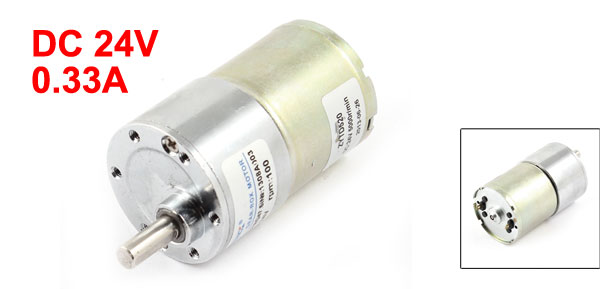Product Name Gear Motor Rated Voltage DC 24V Rated Current 0.33A Rated Torque 2.6Kg.cm No-Load Speed 100 RPM Reduction Ratio 1/47.5 Shaft Size 15 x 6mm/0.6" x 0.24" (L*D) Motor Body Length 30mm/1.2" Gear Box Motor Body Diameter 37mm/1.46" Thread Diameter 2.5mm/0.1" Total Length(Included Pin) 83mm/3.39" Material Metal, Electronic Parts Color Gold Tone, Silver Tone Weight 187g Package Content 1 x Gear Motor - Reviews