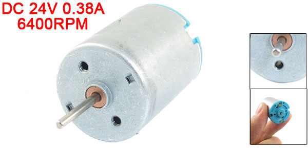 Product Name DC Motor Rated Voltage DC 24V Rated Current 0.38A Speed 6400RPM Shaft Diameter 2mm/ 0.078" Shaft Length 15mm/ 0.59" Body Diameter 24mm/ 0.94" Total Length 50mm/ 2" Main Color Silver Tone Material Metal Weight 41g Package 1 x DC Motor - Reviews