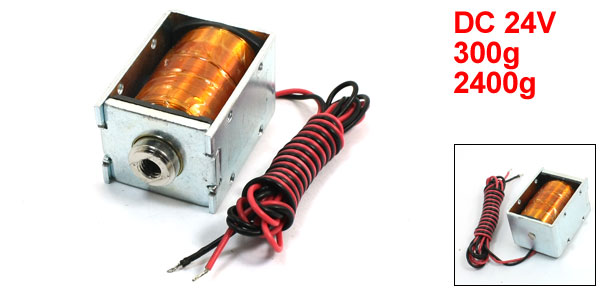 DetailsDC 24V 10.5mm/300g 2400g Intermittent Actuator Electromagnet Solenoid  Product Name DC Solenoid Electromagnet Rated Voltage & Current DC 24V 0.96A Power 23W Action Form Pull Type Force Stroke: 10.5mm 300g/0.66lb Stroke: 0mm 2400g/5.3lb Power On Type Intermittent 10% Max Power On Time 2 Second Body Size 40 x 29 x 24mm/1.6" x 1.2" x 0.95"(L*W*H) Cable Length 55cm/21.7" Material Metal, Electronic Parts Weight 145g Package Content 1 x DC Solenoid Electromagnet