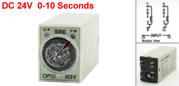 Product Name Time Relay Type H3Y-2 Rated Voltage DC 24V Contact Resistive 5A 250V AC Time Range 0-10 Seconds Size (Approx.) 6.5 x 2.8 x 2.1cm / 2.6" x 1.1" x 0.83" (L*W*T) Color Gray Weight 46g Package Content 1 x Time Relay - Reviews
