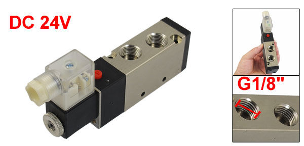 Type 5 Way 2 Position Single Head Type Power Consumption DC 24V 3W 125mA Working Pressure 1.5-8kgf/cm2 Temperature 60C Joint Bore Size(Approx) Air Input=Air Output=G3/8", Exhaust=G1/4" Threaded Port Size(Approx) Air Input=Air Output=16mm, Exhaust=13mm Hex Connector Inner Dia(Approx) 15.5mm/ 0.61" Fix Hole Diameter 4.5mm/ 0.18" Overall Size(Approx) 14.5 x 2.7 x 6.7cm/ 5.7" x 1.1" x 2.6" (L*W*H) Color Silver Tone, Black Indicator Color
