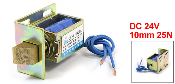 Product Name Door Solenoid Model JF-S104DL Rated Voltage DC 24V 1A Rated Stroke & Force 10mm 25N Type Pull Body Size 68 x 42 x 31mm/2.7" x 1.6" x 1.2"(L*W*H) Mount Hole Size 13 x 5mm/0.51" x 0.2"(L*W) Mounting Hole Center Distance 30 x 30mm/1.2" x 1.2"(L*W) Cable Length 19cm/7.5'' Material Metal, Electronic Parts Net Weight 200g Package Content 1 x Door Solenoid Electromagnet - Reviews