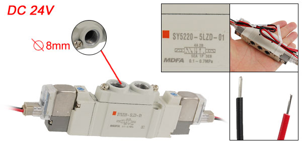 Product Name Solenoid Valve Model No. SY5220-5LZD-01 Actuation Type 2 Position Double Pilot Type Internal Piloted Lead Wire L Plug Connector w Lead Wire Wire Length 29cm / 11.4" Rated Voltage DC 24V Thread Port Size 8mm / 0.315" Operating Pressure Rage 0.1-0.7MPa