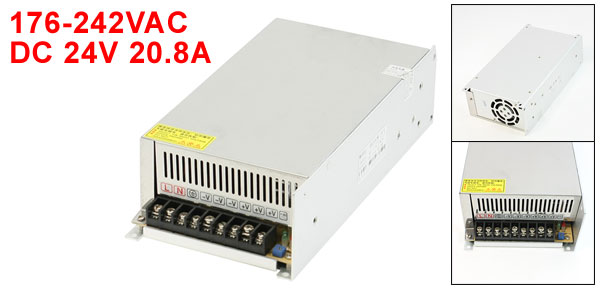 Item Name Switching Power Supply Model No. HX-500W-24V Power Type Constant Voltage Input 176-242VAC Output DC 24V 20.8A Power 500W Size 24 x 12.3 x 6.5cm / 9.5" x 4.9" x 2.6" (L*W*H) Case Material Metal, Aluminum Alloy Main Color Silver Tone Net Weight 1351g Package Content 1 x Switching Power Supply - Reviews