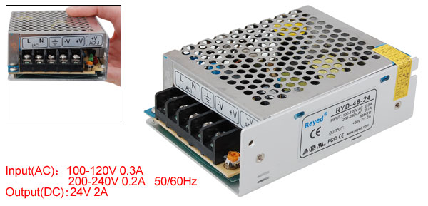 Product Name Switching Power Supply Input(AC) 100-120V 0.3A 200-240V 0.2A 50/60Hz Output(DC) 24V 2A Material Metal, Electronic Parts Size(Approx) 11 x 7.8 x 3.5cm/ 4.3" x 3.1" x 1.4"(L*W*T) Color As Picture Show Weight 250g Package Content 1 x 24V 2A Switching Power Supply - Reviews