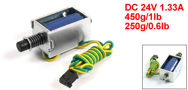 Product Name DC Solenoid Electromagnet Rated Voltage & Current DC 24V 1.33A Power 32W Action Form Push Pull Type Force Stroke: 2mm 450g/1lb