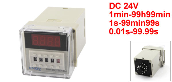 DetailsDC 24V 2NO 2NC 1min-99h99min AC 220V 5A Delay Timer Relay DH48S  Product Name Time Relay Model DH48S(JSS48A) Control Voltage DC 24V Contact Resistive Load AC 220V 5A Contact Type DPDT, 2NO 2NC Number of Terminals 11 Time Range 1min-99h99min