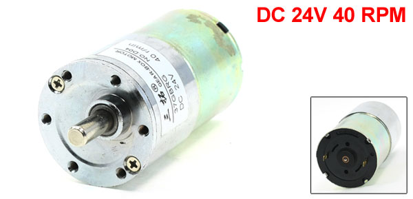 Product Name DC Geared Motor Rated Voltage DC 24V Rated Current 30mA Speed 40 RPM Shaft Diameter 4mm/ 0.15" Overall Size 38 x 85mm/ 1.5" x 3.3" (D*H) Main Color Silver Tone Material Metal Weight 203g Package 1 x DC Geared Motor - Reviews
