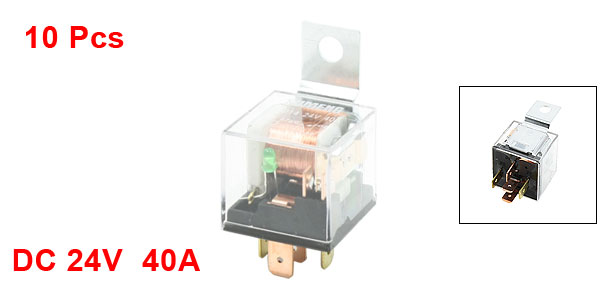 Product Name Car Relay Model No. JD2914 Rated Current 40A Rated Voltage DC 24V Contact Type 1NO 1NC(SPDT) Pin Number 5 Indicator Light Color Green Size 2.8 x 2.8 x 2.5cm / 1.1" x 1.1" x 1" (L*W*T) Material(External) Plastic, Metal Main Color Clear, Black Weight 384g Package Content 10 x Car Relay