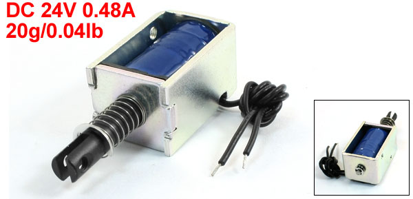Product Name DC Solenoid Electromagnet Rated Voltage & Current DC 24V 0.48A Power 11.5W Action Form Push Pull Type Force 20g/0.04lb Stroke 5mm/0.2" Route 8mm/0.3" Power On Type Continuous Body Size 19 x 16 x 30mm/0.75" x 0.63" x 1.2"(L*W*H) Cable Length 13cm/5.1" Material Metal, Electronic Parts Weight 44g Package Content 1 x DC Solenoid Electromagnet - Reviews