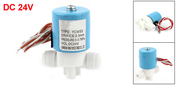 Product Name Solenoid Water Valve Model YCWS3 Use Fluid Air, Water, Oil Rated Voltage DC24V Orifice 2.5mm Fit Pipe Outer Dia 6.35mm/ 1/4" Pressure 0-0.7Mpa Total Size 5 x 3 x 6cm/ 2" x 1.2" x 2.4" (L*W*H) Cable Length 32cm/ 12.6" External Material Metal, Plastic Color Blue, White Net Weight 142g Package Content 1 x Solenoid Water Valve - Reviews