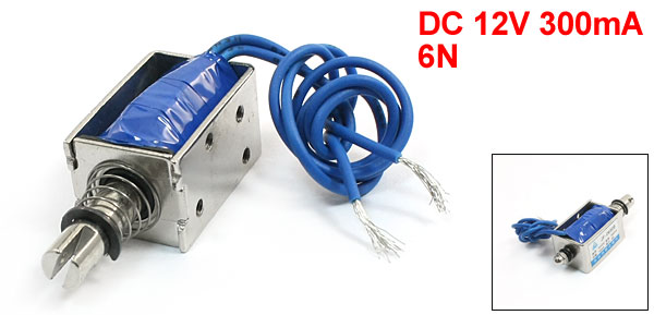 Product Name DC Solenoid Electromagnet Model JF-0630B Rated Voltage & Current DC 12V 300mA Action Form Push Pull Type Force 6N Stroke 6.5mm/0.26" Route 10mm/0.4" Body Size 30 x 19 x 16mm/1.2" x 0.7 x 0.6"(L*W*H) Cable Length 20cm/7.8" Material Metal, Electronic Parts Weight 32g Package Content 1 x DC Solenoid Electromagnet - Reviews