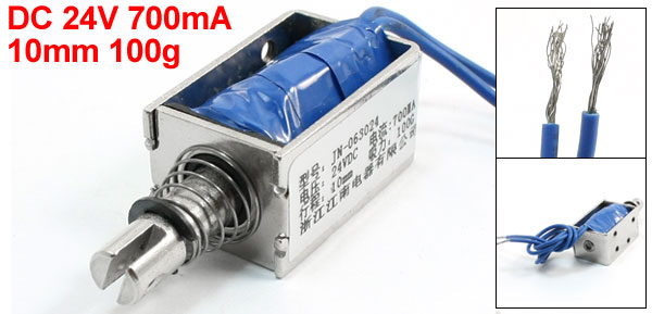 Product Name DC Solenoid Electromagnet Rated DC 24V 700mA Type Pull Force & Stroke 10mm 100g Body Size 30 x 20 x 17mm/1.2" x 0.8" x 0.67"(L*W*H) Plunger Bar Size 35 x 7mm/1.4" x 0.28"(L*D) Screw Hole Diameter 2.5mm/0.1" Plunger Hole 2mm/0.08" Wire Length 22cm/8.7" Material Metal, Electronic Parts Weight 45g Package Content 1 x DC Solenoid Electromagnet - Reviews