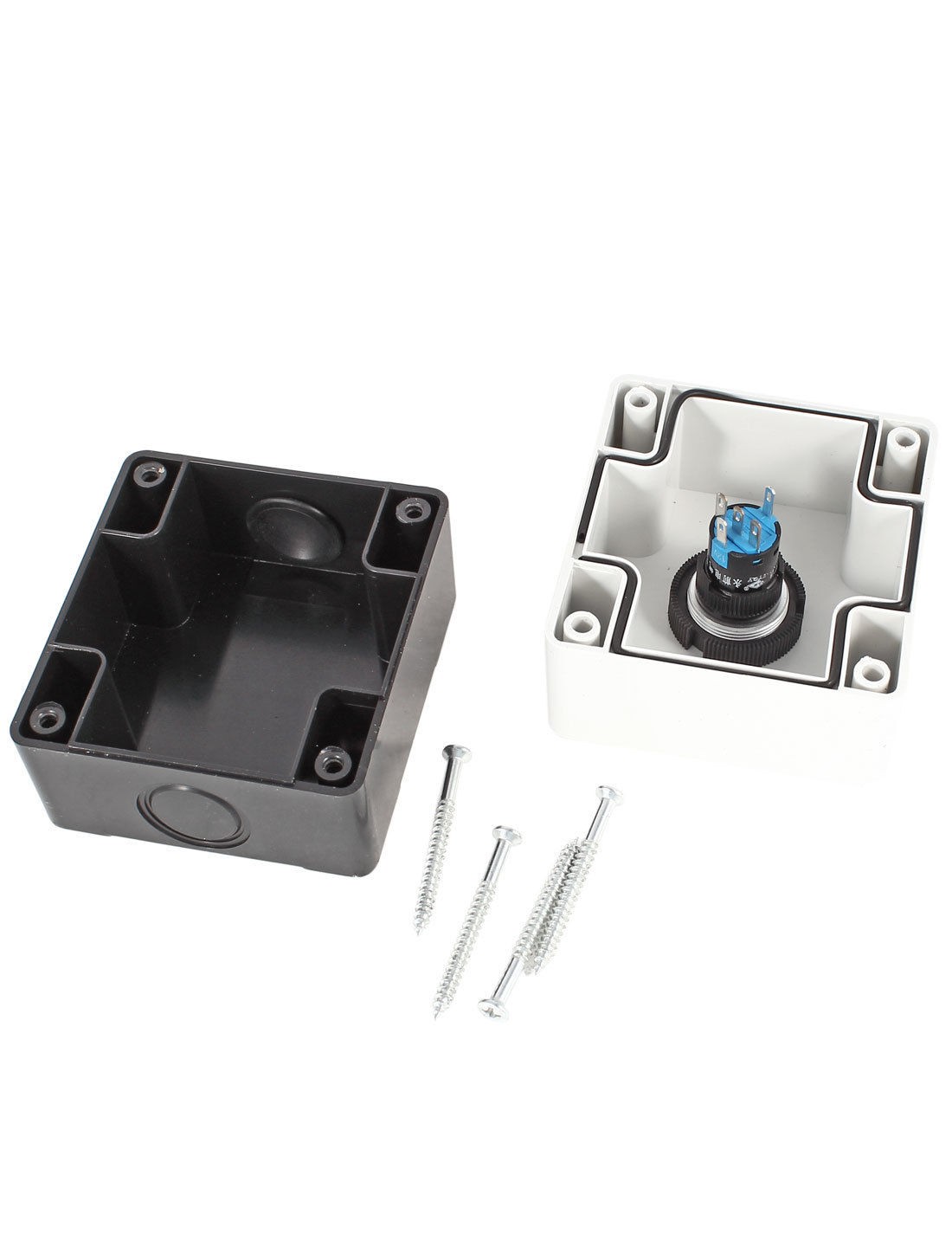 Product Name Push Button Station Action Type MomentaryType Hole Diameter 22mm/ 0.87" Ith AC 220V 5A Lamp Voltage 24V Lamp Color Blue Contact Type SPDT 1 NO 1 NC Box Size 78 x 72 x 64mm/ 3.1" x 2.8" x 2.5" (L*W*H) Switch Size 40 x 29mm/ 1.5" x 1.2" x 2.5"(H*Max.D) Mounting Hole Diameter 5mm/ 0.2" Mounting Hole Distance 64 x 58mm(Center to Center) Button Color Blue External Material Plastic External Color Black, White Net Weight 111g Package Content 1 x Push Button Station