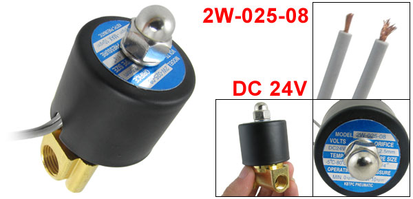 Product Name Solenoid Valve Model No. 2W-025-08 Motion Type Direct Drive Type Two-position, Two-way Working Medium Air, Water, Oil Voltage DC 24V Operating Pressure 0 ~ 1Mpa Joint Pipe Size 1/4" Thread Diameter 12mm/ 15/32" Total Size (Approx.) 40 x 40 x 75mm/ 1.6" x 1.6" x 3" (L*W*H) Cable Length 230mm/9.1" Material Brass, Plastic Color Black, Gold Tone Weight 240g Package Content 1 x Solenoid Valve - Reviews