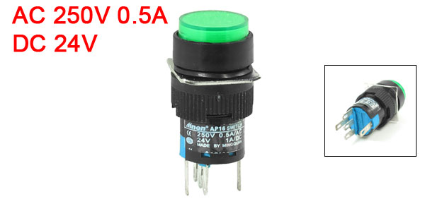 DetailsDC 24V Green Indicatior Light Self Locking Push Button Switch  Item Name Push Button Switch Switch Type Self-locking Contact ( NO / NC) Switch Working Voltage AC 250V 0.5A Indicator Lamp Voltage DC 24V Button Cap Color Green Switch Color Green, Black Button Cap Dia. 1.5 cm / 0.6" Mounting Thread Dia. 17mm / 0.7" Total Size 4.1 x 1.8 x 1.8cm / 1.6" x 0.7" x 0.7"(L * W* H) Material Plastic w Electronic Parts Weight 8g Package Content 1 x Push Button Switch