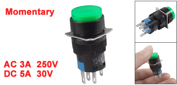 Product Name Push Button Switch Action Type Momentary Contact Type 1 NO, 1NC Rating Voltage AC 3A / 250V DC 5A / 30V Terminals Quanlity 5Pins Light Voltage DC 24V Mounting Hole Diameter 15.5mm / 0.6" Button Size 15.5mm / 0.6" Terminals Pitch 6mm / 0.236" Overall Size 18.5 x 18.5 x 39mm / 0.73" x 0.73" x 1.5"(L*W*H) Material Plastic & Metal Color Green & Black Weight 7g Package Content 1 x Push Button Switch - Reviews
