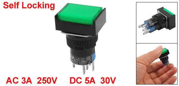 Product Name Push Button Switch Action Type Self Locking Contact Type 1 NO, 1NC Rating Voltage AC 3A / 250V DC 5A / 30V Terminals Quanlity 5 Pins Light Voltage DC 24V Mounting Hole Diameter 15.5mm / 0.6" Button Size 21 x 15mm / 0.83" x 0.6"(L*W) Terminals Pitch 5mm / 0.2" Overall Size 23 x 18 x 39mm / 0.9" x 0.71" x 1.5"(L*W*H) Material Plastic & Metal Color Green & Black Weight 8g Package Content 1 x Push Button Switch - Reviews