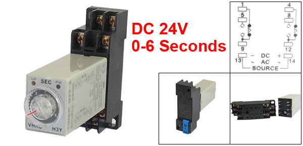 Product Name Time Relay + Socket Type H3Y-2 Contact Type DPDT Source DC 24V Contact 5A 250VAC Resistive Load Time Range 0-6 Seconds Number of Terminals 8 Mount Rail Type 3.5mm DIN Rail Fixing Mount Hole Size 6 x 4mm/ 2.4" x 0.15"(L*W) Fixing Mount Center Hole Distance 57 x 15mm/2.2" x 0.6"(L*W) Total Size (Approx.) 68 x 22 x 88mm/ 2.7" x 0.9" x 3.5"(L*W*H) Color Black, Gray Net Weight 67g Package Content 1 x Time Relay