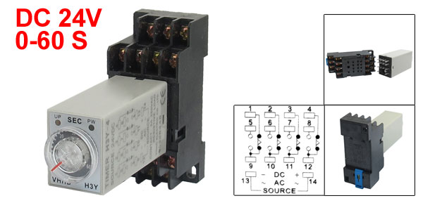 Product Name Time Relay + Socket Type H3Y-4 Contact Type 4PDT Source DC 24V Contact 5A 250VAC Resistive Load Time Range 0-60 Seconds Number of Terminals 14 Mount Rail Type 3.5mm DIN Rail Fixing Mount Hole Size 6 x 4mm/ 2.4" x 0.15"(L*W) Fixing Mount Center Hole Distance 59 x 22mm/2.3" x 0.9"(L*W) Total Size (Approx.) 68 x 29 x 88mm/ 2.7" x 1.1" x 3.5"(L*W*H) Color Black, Gray Net Weight 83g Package Content 1 x Time Relay