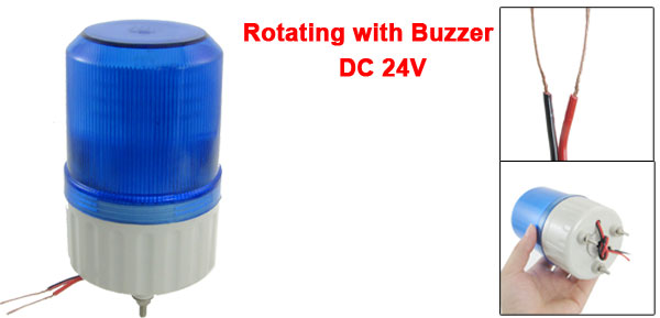 DetailsDC 24V Industrial Blue LED Signal Warning Rotating Light w Buzzer Siren  Product Name Industrial Signal Light Type Rotating with Buzzer Rated Voltage DC 24V Light Color Blue Material Plastic, Electronic Parts Thread Diameter 4mm / 0.16" Wire Length 17cm / 6.7" Overall Size(Approx.) 8.4 x 15cm / 3.3" x 5.9"(Dia.*H) Body Color Red, Gray Net Weight 163g Package Content 1 x Industrial Signal Light
