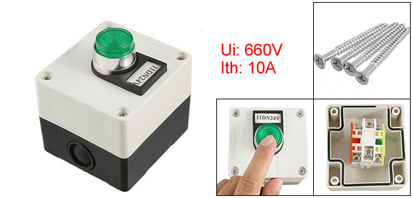 Product Name Push Button Station Contact Type 1NO 1NC Action Type Momentary Switch Ui: 660V Ith: 10A Lamp Voltage DC 24V Material Plastic, Metal Button Diameter(Approx.) 2.5cm/ 1" Overall Size 7.8 x 7.1 x 8.6cm/ 3" x 2.8" x 3.4" (L*W*H)