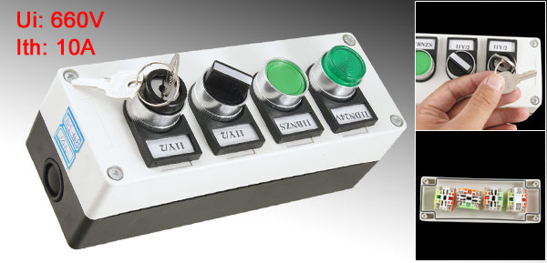 Product Name Push Button Station Contact Type(Each Switch) 1NO 1NC Switch Ui: 660V Ith: 10A Lamp Voltage DC 24V Material Plastic, Metal Button Diameter(Approx.) 2.5cm/ 1" Overall Size(not include the button) 19.2 x 6.7 x 7.8cm/ 7.6" x 2.6" x 3" (L*W*H)