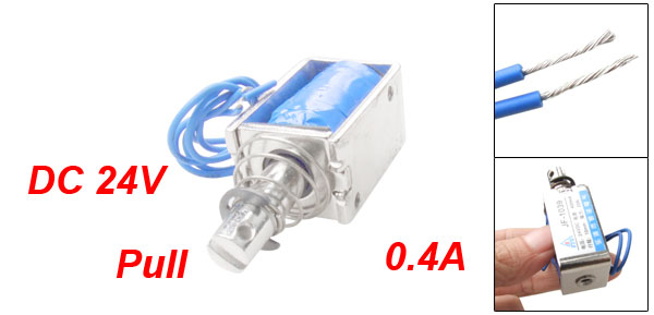 Product Name DC Solenoid Electromagnet Material Metal, Electronic Parts Color Blue, Silver Tone Rated Voltage DC 24V Action Form Pull Rated Stroke 10mm, 25N