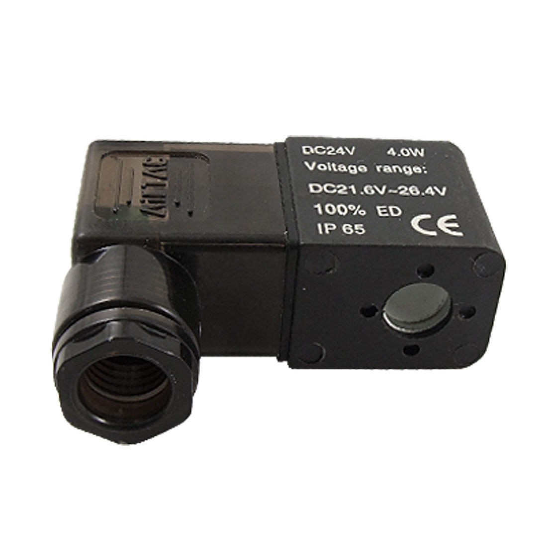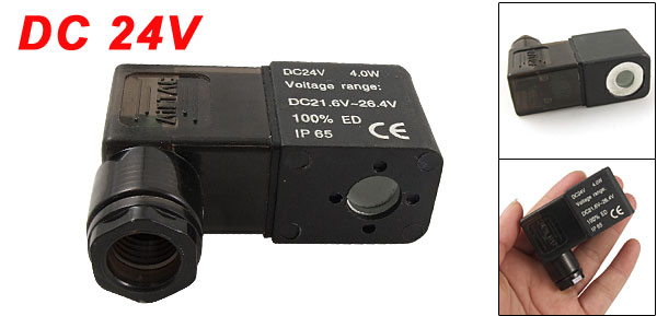 DetailsDC 24V Pneumatic Control Air Solenoid Valve Coil Black Iuvgw  Product Name Solenoid Valve Coil Material Plastic, Electrical Part Voltage DC 24V 4.0VA Voltage Range DC 21.6V~26.4V Size(Approx) 5.8 x 4.5 x 2.2cm / 2.3" x 1.8" x 0.9"(L*W*H) Core Dia. 0.9cm / 0.35", 0.8cm/0.31" Color Black Net Weight 61g Package Content 1 x Solenoid Valve Coil