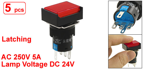 Item Name Push Button Switch Contact Type 1NO, 1NC Switch Type Latching Type Switch Working Voltage AC 250V, 5A Lamp Voltage DC 24V Thermal Current(Ith) AC 220V 5A Lamp Cap Color Red Switch Color Black, Red Pin Number 5 Button Size 20 x 14mm/ 0.8" x 0.55" (L*W) Mounting Thread Dia. 16mm/ 0.63" Total Size 24 x 18 x 40mm/ 0.94" x 0.7" x 1.6"(L*W*H) Material Plastic, Electronic Parts Weight 40g Package Content 5 x Push Button Switch - Reviews