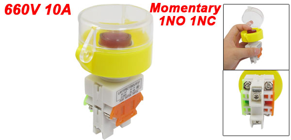 Product Name Pushbutton Switch Action Type Momentary Button Type High Flat Button Contact Type 1NO 1NC(DPST) Ui(AC-15) 660V Ith(AC-15) 10A Lamp Voltage 24V Terminals Quantity 6 Screw Terminals Thread Diameter 24mm/0.94" Button Diameter 24mm/0.94" Protection Cover Diameter 55mm/2.17" Suitable Board(Max.) 5mm/ 0.197"(Adjustable) Overall Size 73 x 55 x 98mm / 2.87" x 1.89" x 3.86" (L*W*H) Material Plastic, Metal, Electric Parts Lamp Color Red Color Gray, Yellow, Red Net Weight 73g Package Content 1 x Pushbutton Switch - Reviews