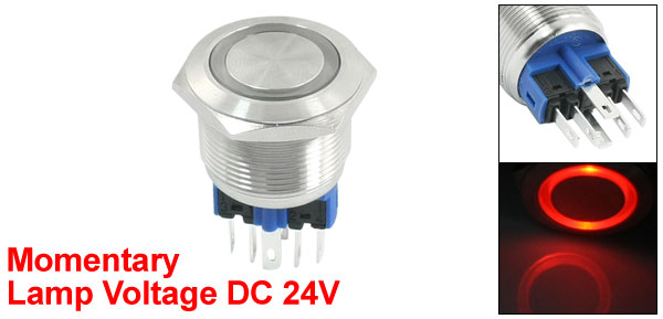 Item Name Push Button Switch Action Type Momentary Type LED Type Angel Eye LED Head Shape Flat Head Contact 1NO 1NC, DPST Switch Rating AC 250V, 5A Lamp Voltage DC 24V LED Color Red Pin Number 6 Thread Diameter 22mm/0.87" Total Size 38 x 25mm/1.5" x 1"(L*Max.W) Material Stainless Steel, Plastic, Electric Parts Housing Color Silver Tone, Blue Net Weight 25g Package Content 1 x Push Button Switch - Reviews