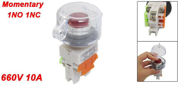 Product Name Pushbutton Switch Action Type Momentary Button Type High Flat Button Contact Type 1NO 1NC(DPST) Ui(AC-15) 660V Ith(AC-15) 10A Lamp Voltage 24V Terminals Quantity 6 Screw Terminals Thread Diameter 24mm/0.94" Button Diameter 24mm/0.94" Protection Cover Diameter 50mm/1.97" Suitable Board(Max.) 5mm/ 0.197"(Adjustable) Overall Size 70 x 50 x 93mm / 2.76" x 1.97" x 3.66" (L*W*H) Material Plastic, Metal, Electric Parts Lamp Color Red Color Gray, Transparent, Red Net Weight 68g Package Content 1 x Pushbutton Switch - Reviews