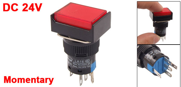 Product Name Push Button Switch Action Type Momentary Contact Type 1 NO, 1NC Rating Voltage AC 3A / 250V DC 5A / 30V Terminals Quanlity 5 Pins Light Voltage DC 24V Mounting Hole Diameter 15.5mm / 0.6" Button Size 21 x 15mm / 0.83" x 0.6"(L*W) Terminals Pitch 5mm / 0.2" Overall Size 23 x 18 x 39mm / 0.9" x 0.71" x 1.5"(L*W*H) Material Plastic & Metal Color Red & Black Weight 8g Package Content 1 x Push Button Switch - Reviews