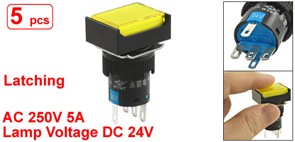 DetailsDC 24V Yellow Lamp 1NO 1NC Latching Rectangular Push Button Switch 5 Pcs  Item Name Push Button Switch Contact Type 1NO, 1NC Switch Type Latching Type Switch Working Voltage AC 250V, 5A Lamp Voltage DC 24V Thermal Current(Ith) AC 220V 5A Lamp Cap Color Yellow Switch Color Black, Yellow Pin Number 5 Button Size 20 x 14mm/ 0.8" x 0.55" (L*W) Mounting Thread Dia. 16mm/ 0.63" Total Size 24 x 18 x 40mm/ 0.94" x 0.7" x 1.6"(L*W*H) Material Plastic, Electronic Parts Weight 40g Package Content 5 x Push Button Switch