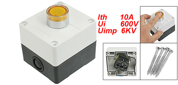 Product Name Push Button Switch Action Type Momentary Contact Type NO Working Voltage & Current AC 240V 3A Ith 10A Ui 600V Uimp 6KV Lamp Voltage DC 12V Lamp Color Yellow Push Button Diameter 2.5cm/ 0.98" Overall Size 7.7 x 7.1 x 6.4cm/ 3" x 2.8" x 2.5"(L*W*H) Shell Material Plastic Color Black, White Net Weight 173g Package Content 1 x Push Button Switch - Reviews