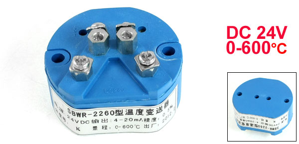 Product Name Temperature Transmitter Model SBWR-2260 Material Plastic Type K Type Temperature Range 0-600 Celsius Degree Output Voltage 4-20mA Power Supply 24V DC Precision 0.2% Size 4 x 4.3 x 2cm/1.6" x 1.7" x 0.8"(L*W*T) Color Blue Net Weight 34g Package Content 1 x Temperature Transmitter