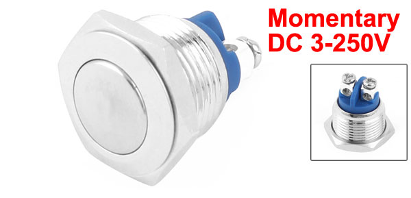 Item Name Push Button Switch Action Type Momentary Type Head Shape Round Flat Head Contact SPST Voltage DC 3-250V Terminals Number 2 Thread Diameter 16mm/0.6" Total Size 24 x 19mm/0.95" x 0.75" (L*Max.W) Material Metal, Plastic, Electric Parts Housing Color Silver Tone Net Weight 14g Package Content 1 x Push Button Switch - Reviews