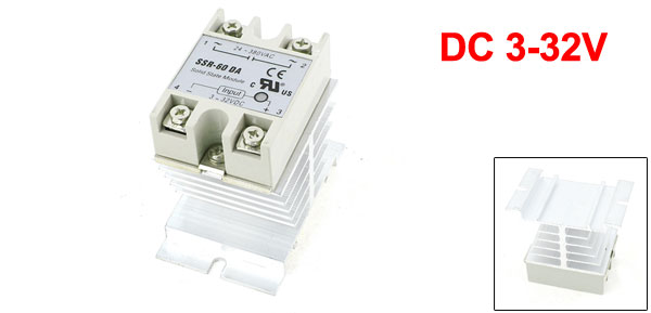 Product Name Solid State Relay w Heatsink Model No. SSR-60DA Control Voltage DC 3-32V Output Voltage AC 24-380V 60A Phase Single Phase Screw Terminal 4 Fixing Hole Dia 5mm/0.2" Fixing Hole Center Distance 7.1cm/2.8" Relay Size (Approx.) 6 x 4.5 x 2.3cm/2.4" x 1.8" x 0.94"(L*W*H) Total Size 8 x 5 x 7.2cm/3.1" x 2" x 2.8"(L*W*H) Heatsink Material Aluminum, Plastic, Metal Color Silver Tone, Clear Weight 206g Package Content 1 x Solid State Relay w Heatsink - Reviews
