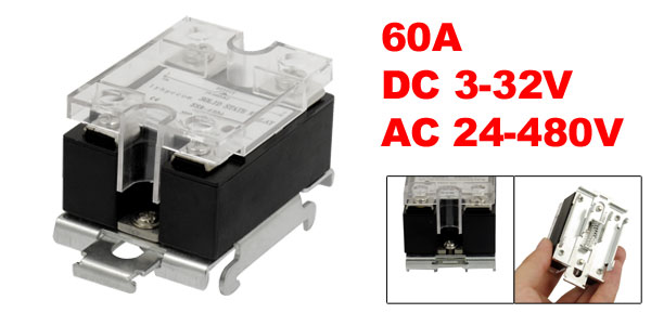 Product Name Solid State Relay w DIN Rail Base Type SSR-60DA Working Current 60A Input DC 3-32V Output AC 24-480V For DIN Rail 35mm / 1.4" Total Size (Approx.) 8.1 x 4.5 x 4.6cm / 3.2" x 1.8" x 1.8" (L * W * H ) External Material Plastic, Metal Main Color Black, Silver Tone Indicator Lamp Color Red Weight 146g Package Content 1 x Solid State Relay w DIN Rail Base