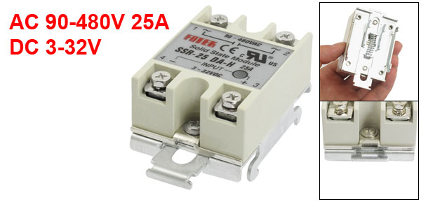 Product Name Solid State Relay w DIN Rail Type SSR-25DA-H Working Current 25A Input DC 3-32V Output AC 90-480V For DIN Rail 35mm / 1.4" Total Size (Approx.) 8 x 4.4 x 4.6cm / 3.1" x 1.7" x 1.8" (L * W * H ) External Material Plastic, Metal Color Gray, Silver Tone Weight 147g Package Content 1 x Solid State Relay DIN Rail Base