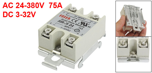 Product Name Solid State Relay w DIN Rail Type SSR-75DA Working Current 75A Input DC 3-32V Output AC 24-380V For DIN Rail 35mm / 1.4" Total Size (Approx.) 8 x 4.4 x 4.6cm / 3.1" x 1.7" x 1.8" (L * W * H ) External Material Plastic, Metal Color Gray, Silver Tone Weight 163g Package Content 1 x Solid State Relay w DIN Rail