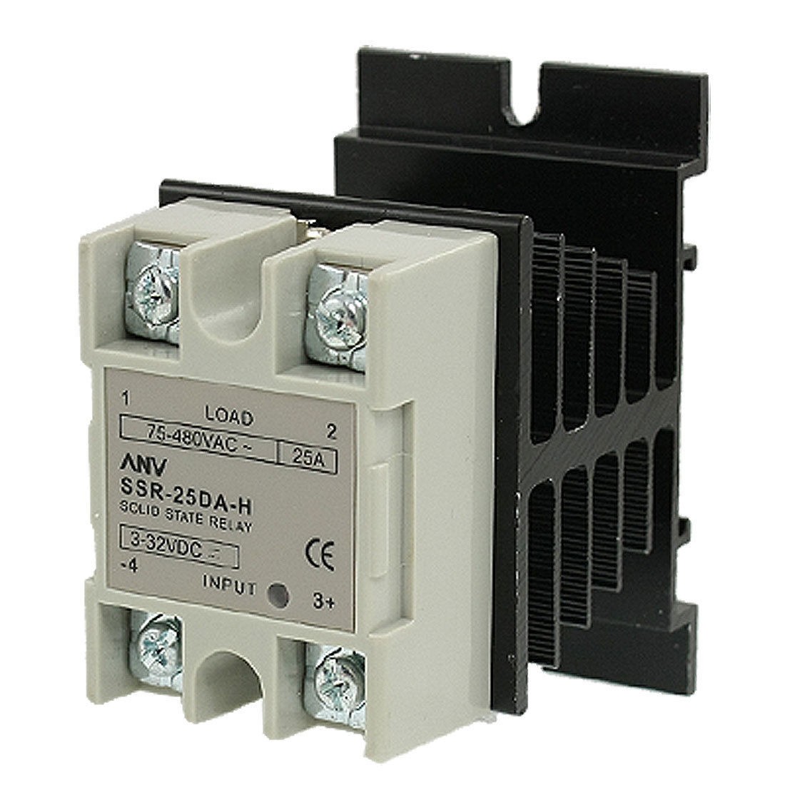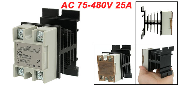 Product Name Solid State Relay w Heat Sink Type SSR-25DA-H Material Relay: Metal, Plastic, Electric Parts Heat Sink: Aluminum Rated Load Current 25A Input DC 3-32V Output AC 75-480V Relay Size 5.7 x 4.4 x 2.5cm / 2.2" x 1.7" x 1" (L*W*T) Heat Sink Size 8.1 x 5 x 5cm/ 3.1" x 2" x 2"(L*W*H) Total Size 8.1 x 5 x 7.6cm/ 3.1" x 2" x 3"(L*W*H) Main Color Black, Gray Weight 199g Package Content 1 x Solid State Relay