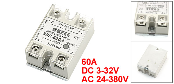 Product Name Solid State Relay Type SSR-60DA Rated Current 60A Input DC 3-32V Output AC 24-380V Relay Size 6 x 4.5 x 2.6cm/ 2.5" x 1.8" x 1"(L*W*T) Material Metal, Plastic, Electric Parts Main Color Silver Tone, Gray Weight 124g Package Content 1 x Solid State Relay - Reviews