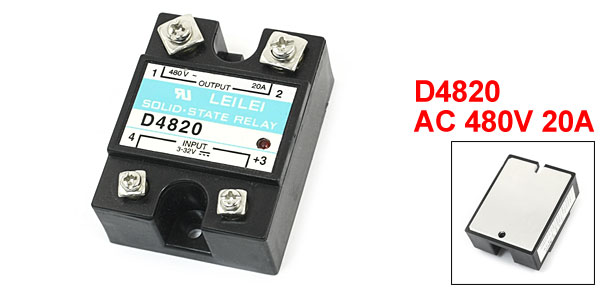 Product Name Solid State Relay Type D4820 Input DC 3-32V Output AC 480V 20A Total Size (Approx.) 59 x 46x 25mm/ 2.4" x 1.7" x 1"(L*W*T) Terminal 4 Mounting Hole Dia 4mm/0.16" Mounting Hole Center Distance 50mm/2" Color Black, Silver Tone Net Weight 98g Total Weight 104g Package Content 1 x Solid State Relay