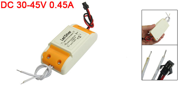 Product Name 8-12 x 1W LED Driver Input AC 100-240V, 50/60Hz Output DC 30-45V, 0.45A Overall Size(Approx.) 9.3 x 4.5 x 2.6cm/3.6"x 1.8"x 1"(L*W*T) Each Wire Length 12cm/4.7" Shell Material Plastic Main Color White, Orange Weight 73g Package Content 1 x LED Driver - Reviews