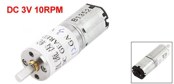 Product Name DC Geared Motor Rated Voltage DC 3V Output Speed 10RPM Mounting Screw Hole Diameter 2mm/0.08" Gearbox Size 12 x 19mm/0.47" x 0.75"(D*H) Shaft Size 3 x 6mm/ 0.12" x 0.24"(D*L) Body Length 34mm/ 1.3" Total Length 43mm/ 1.7" Main Color Silver Tone Material Metal Net Weight 15g Package 1 x DC Geared Speed Reduce Motor  - Reviews