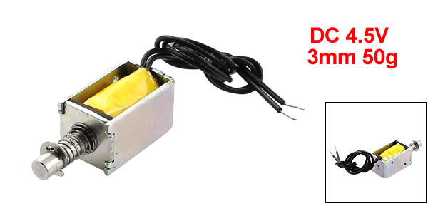 Product Name DC Solenoid Electromagnet Coil Voltage DC 4.5V Action Form Pull Type Rated Stroke & Force 3mm, 50g Connection Rate 20% Body Size 20.5 x 12 x 11mm / 1" x 0.47" x 0.43" (L*W*H) Cable Length 15cm / 6" Plunger Dia. 4mm / 0.16" Plunger Thread Hole Dia. 1.5mm/0.06" Material Metal, Electronic Parts Net Weight 14g Package Content 1 x DC Solenoid Electromagnet - Reviews