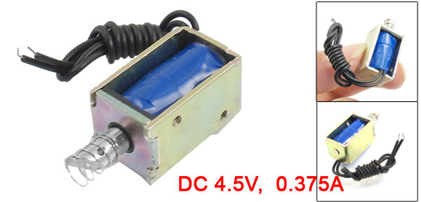 Product Name DC Solenoid Electromagnet Type 0420L-4.5B06 Rated Voltage DC 4.5V Rated Current 0.375A Action Form Pull Rated Stroke 4mm, 28gf Body Size(Approx) 2.1 x 1.2 x 1.1cm / 0.83"x 0.48" x 0.45" (L*W*H) Cylinder Size(Approx) 2.2 x 0.39cm / 0.86" x 0.16" (L*D) Cable Length(Approx) 15.5cm / 6.1" (Each) External Material Metal, Electronic Parts Main Color Silver Tone Weight 14g Package Content 1 x DC Solenoid Electromagnet - Reviews